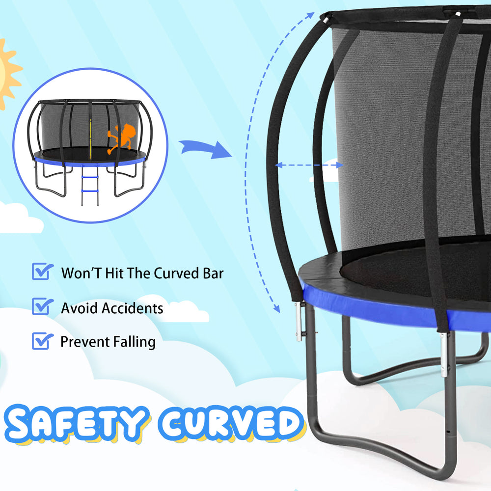 - 【Safety First】Nothing is more important than the safety of your kids! Our trampoline adopts 8 pcs foam-padded curved poles to protect your kids from getting hurt while jumping. Kids trampoline conforms to ASTM F381-16 standard safety regulations.